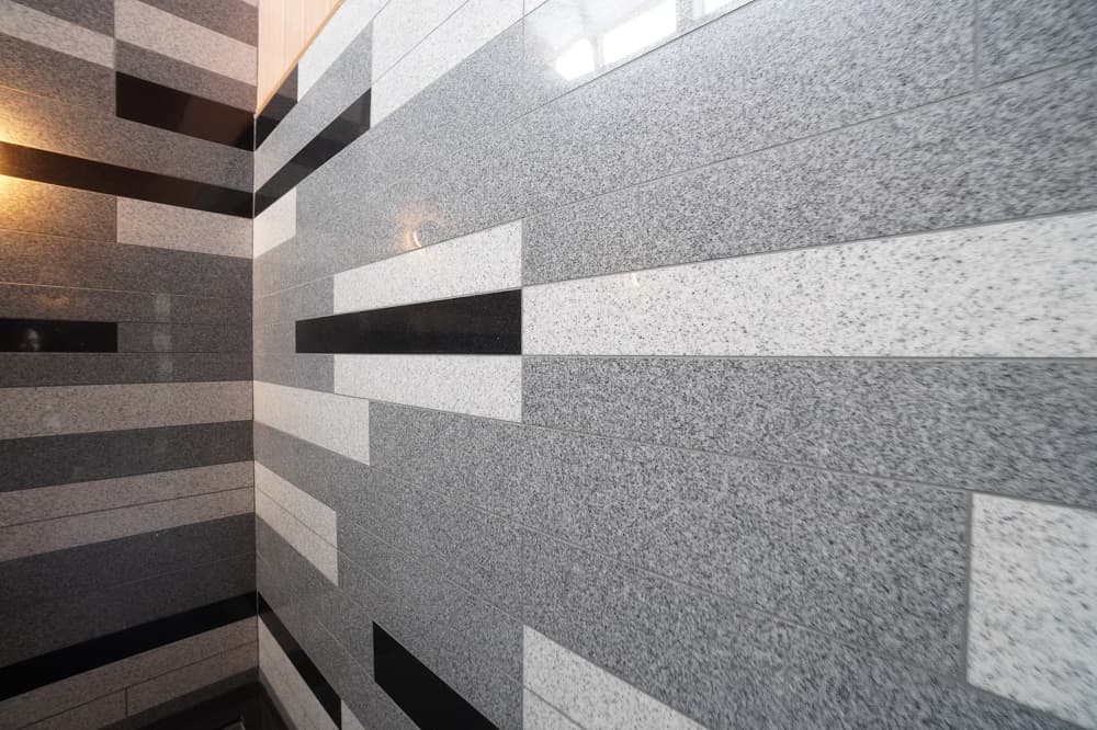 モノトーンでデザインされた3色の「アベイラス ポリッシュ」が浴室内の壁に貼られてリラックスできる落ち着いた空間を演出しています。